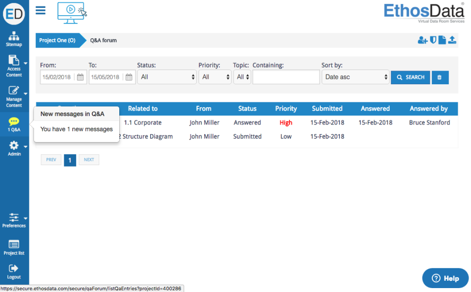 EthosData provides 24/7 phone, email and online chat support, including nights and weekends. In fact, EthosData specialists do all the administrative work for you, uploading documents and setting all necessary permissions. EthosData customer support also prepares activity reports for you. Importantly, all actions of the EthosData team are recorded and audited.