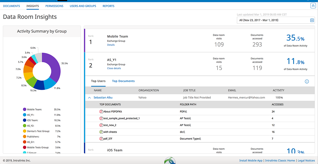 You can access detailed analysis and activity reports. You can view any activity across your files and determine who has viewed your documents.
